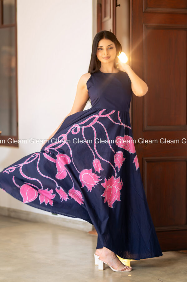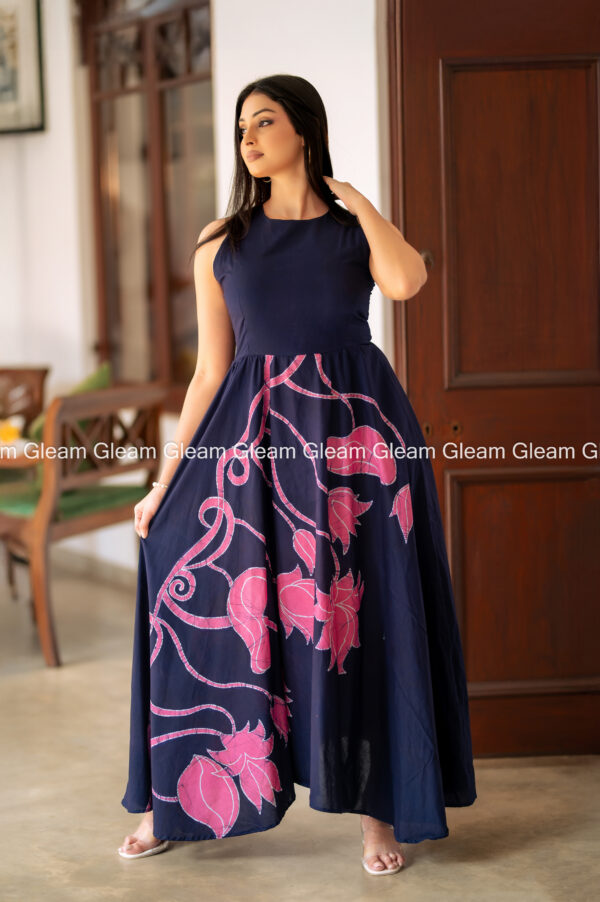 Soft, feminine, and full of charm, the Peach Petal Bloom dress features delicate hand-drawn floral batik in serene peach tones. With its sleeveless silhouette and airy flow, this dress is perfect for sunny days, garden events, or weekend outings with a touch of elegance.