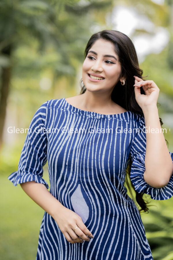 Clean, classic, and effortlessly stylish – the Indigo Lines Dress features bold white hand-drawn batik stripes against a rich dark blue base. With its structured simplicity and timeless color palette, this piece is perfect for both everyday elegance and laid-back sophistication.