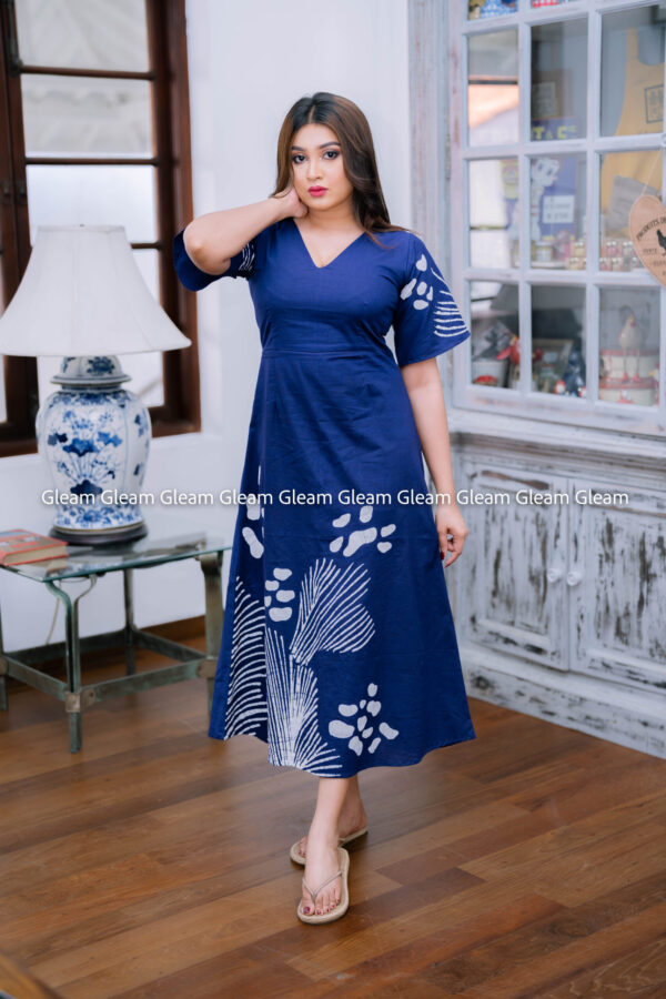 The Ocean Mist Midi captures the calm elegance of the deep sea with its rich navy-blue base and delicate white hand-drawn batik patterns. Designed in a flattering midi length, this dress blends traditional Sri Lankan craftsmanship with a timeless silhouette – perfect for effortless day-to-night style.