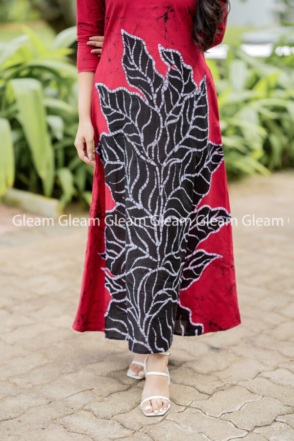 Make a bold statement with this handcrafted batik dress in red, black, and white. The dynamic color blend captures both strength and elegance, making it perfect for festive occasions or stylish evenings.