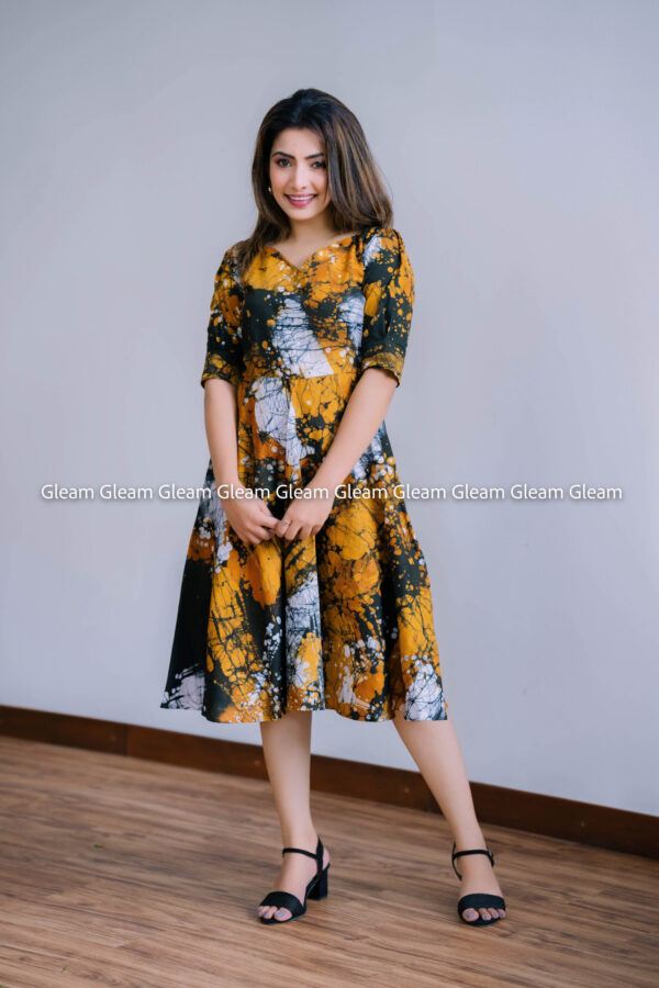 Savanna Swirl Flare Dress – Mustard, Black & White