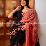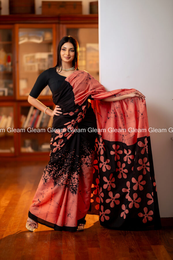 A graceful, dull pink batik saree beautifully contrasted with black floral artistry — hand-made to bring elegance, depth, and timeless charm to every occasion.