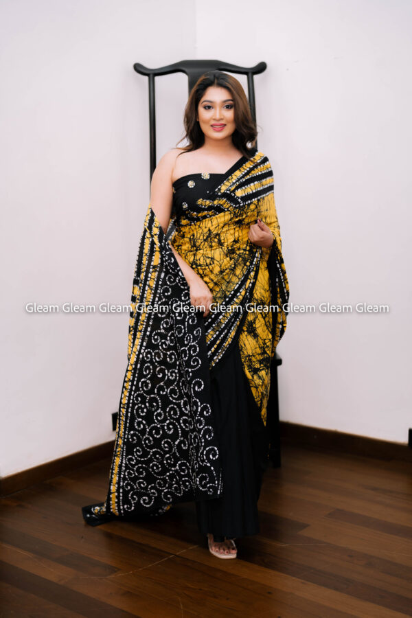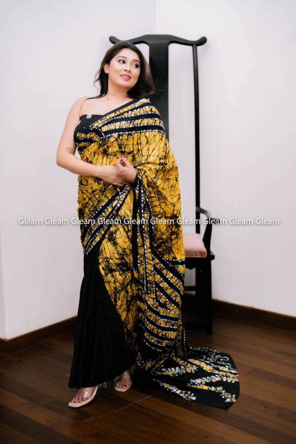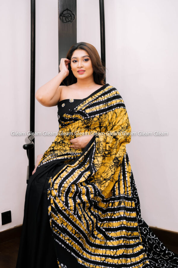 Striking and bold, Golden Ink is a captivating handmade Java batik saree in vibrant yellow and black hues. The dynamic contrast evokes power and elegance, while the traditional wax-resist batik technique brings cultural richness to every detail.