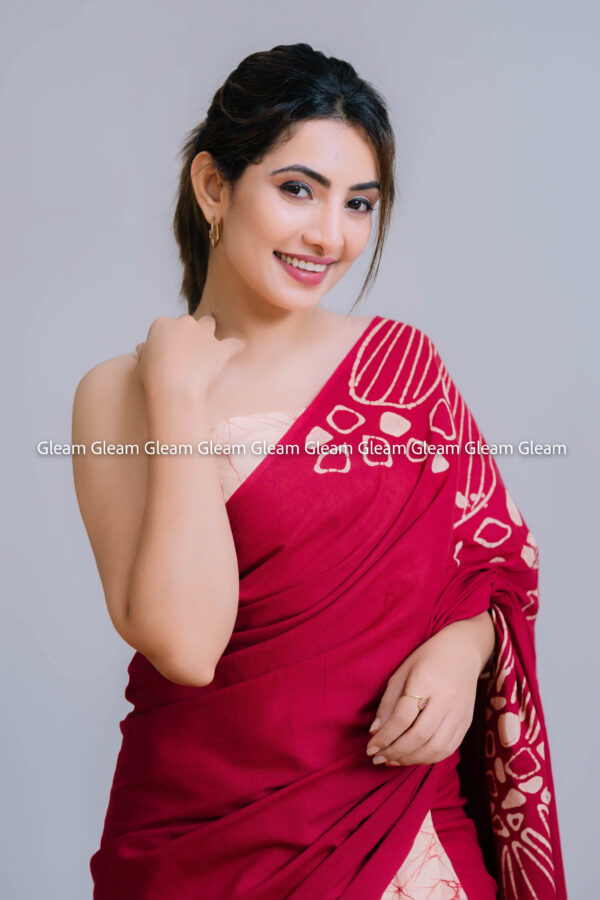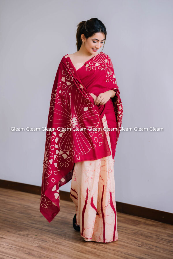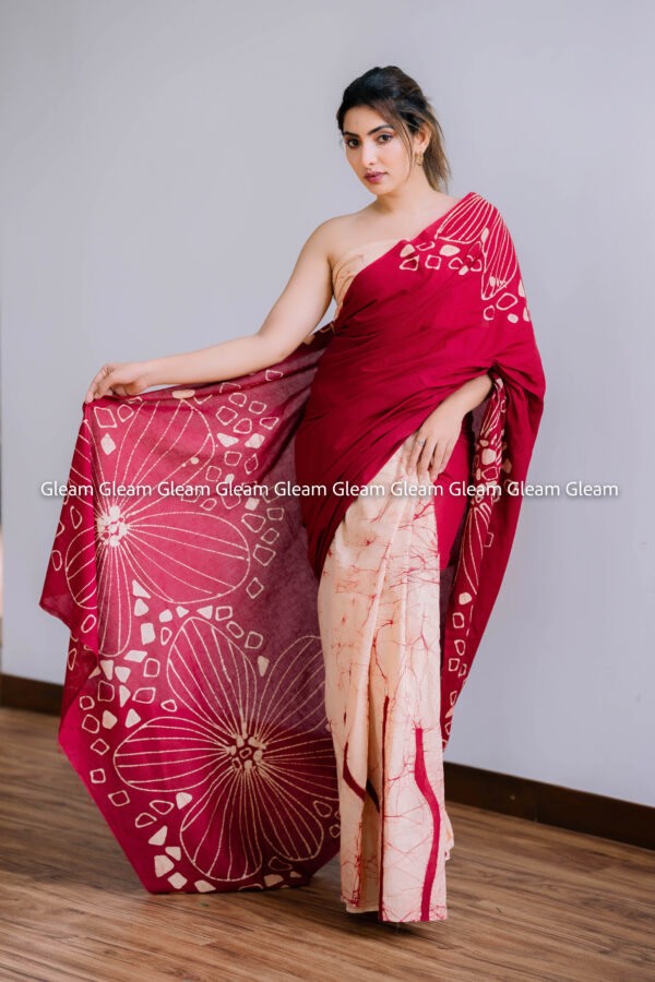 The Maroon Grace Saree is a harmony of delicate peach and deep maroon — a combination that speaks of timeless charm. Its handmade batik design adds texture and depth, making it a versatile choice for both traditional and modern looks.