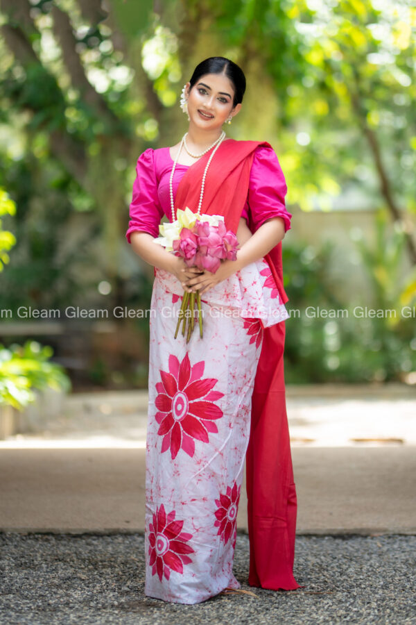 Soft yet vibrant, the Roselle Bloom Saree combines white, red, and hot pink floral batik patterns to create a stunning fusion of elegance and charm. Each handcrafted detail reflects feminine grace and artistic beauty — perfect for celebrations, festive wear, or adding a lively touch to your collection.
