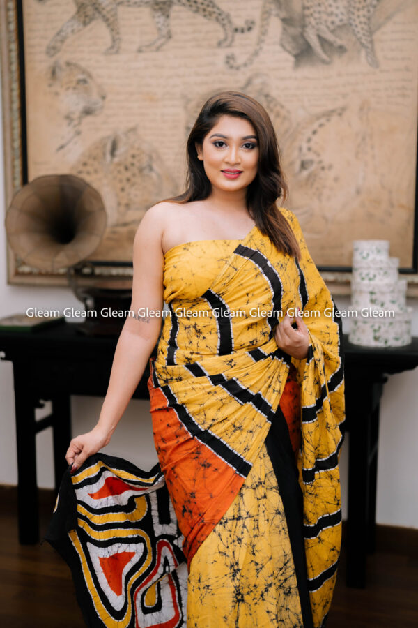 Unleash bold elegance with Sunset Ember, a striking handmade Java batik saree in vibrant yellow, fiery orange, and deep black tones. Inspired by the colors of a tropical sunset fading into night, this saree is a fusion of art, energy, and tradition.