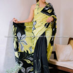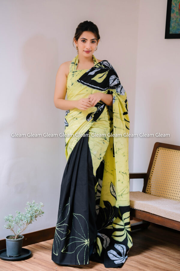 The Vanilla Dusk Saree blends delicate yellow tones with black and white batik patterns for an effortlessly elegant finish. Handmade with care, it’s ideal for those who appreciate understated charm and timeless design.